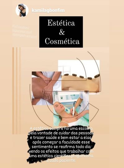 “A Estética sempre foi uma escolha pela vontade de cuidar das pessoas e trazer saúde e bem-estar. Após começar a faculdade, esse sentimento se reafirma todo dia, vendo os efeitos que trabalhar com a estética científica proporciona a cada paciente” (Kamila Bonfim).