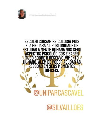 “Escolhi cursar Psicologia, pois ela me dará a oportunidade de estudar a mente humana nos seus aspectos psicológicos e saber sobre o desenvolvimento humano, além de ajudar pessoas” (Matheus Kubiaki).