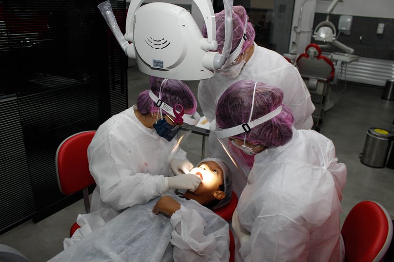 Além dos protocolos de biossegurança comuns adotados desde sempre (gorro descartável, luvas, óculos e máscaras), agora acadêmicos e professores reforçam a vestimenta e o conjunto de acessórios obrigatórios, como máscara cirúrgica N95, protetor facial e avental descartável sobre o jaleco padrão; e os pacientes, ao entrar, recebem jaleco e touca e, ao sair da cadeira do consultório, uma máscara.