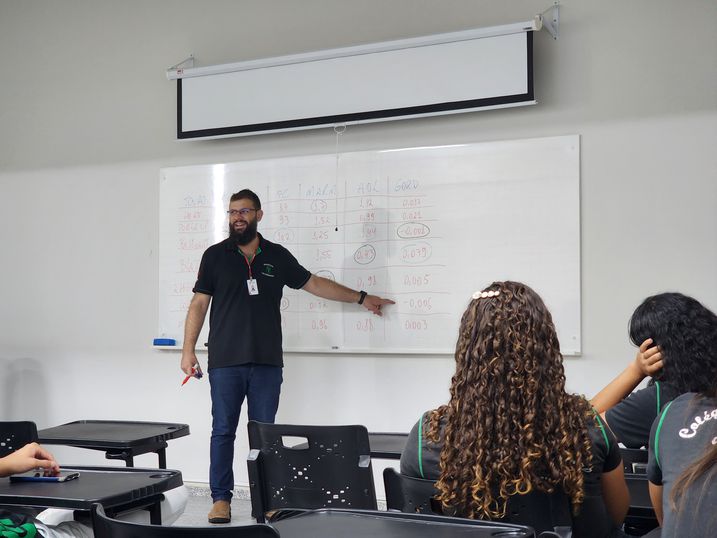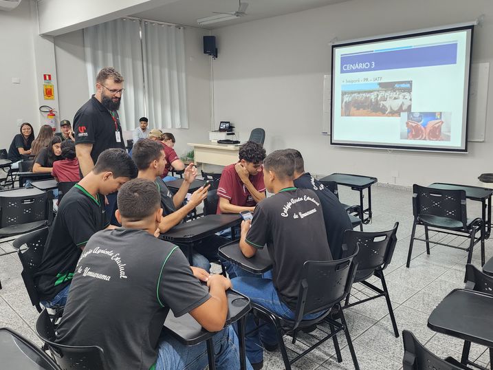 Durante a aula teórica, foram apresentados dados de pesquisas e práticas que os alunos puderam comparar em diferentes cenários na pecuária. Os alunos analisaram catálogos de sêmen e realizaram escolhas simuladas, baseando-se nos conceitos de genética melhoradora. Segundo o professor, eles participaram de uma competição prática em que cada grupo precisou selecionar um touro ideal para uma situação proposta. “Eu expliquei como é feito essa escolha pensando em um conceito de animal melhorador. Passei uma realidade e pedi para eles escolherem para comprar o sémen de um touro para usarem nessa proposta da aula”, comenta.