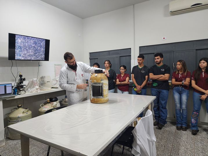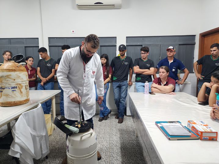 Na sequência, uma aula prática demonstrou a avaliação de doses comerciais de sêmen, com explicações sobre a viabilidade do material genético e os cuidados necessários para armazenamento em botijões criogênicos com nitrogênio líquido. “Expliquei para eles como manter esse sémen vivo, viável, forma que se deve estar bem armazenado, os cuidados no armazenamento para manter a dose de sémen saudável por tempo indeterminado”, explica o professor Denis.