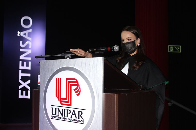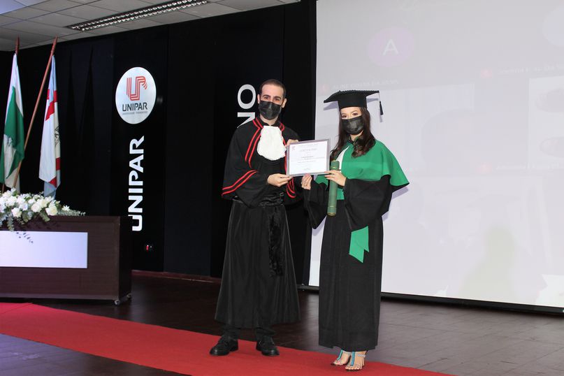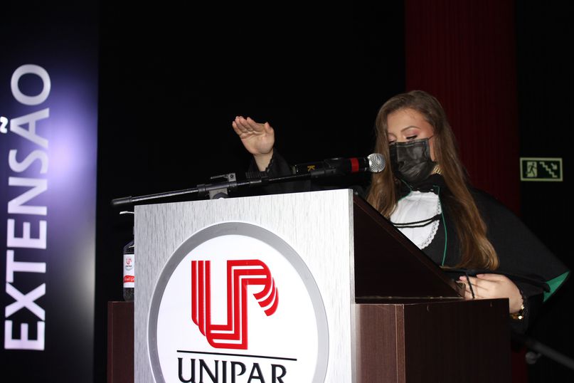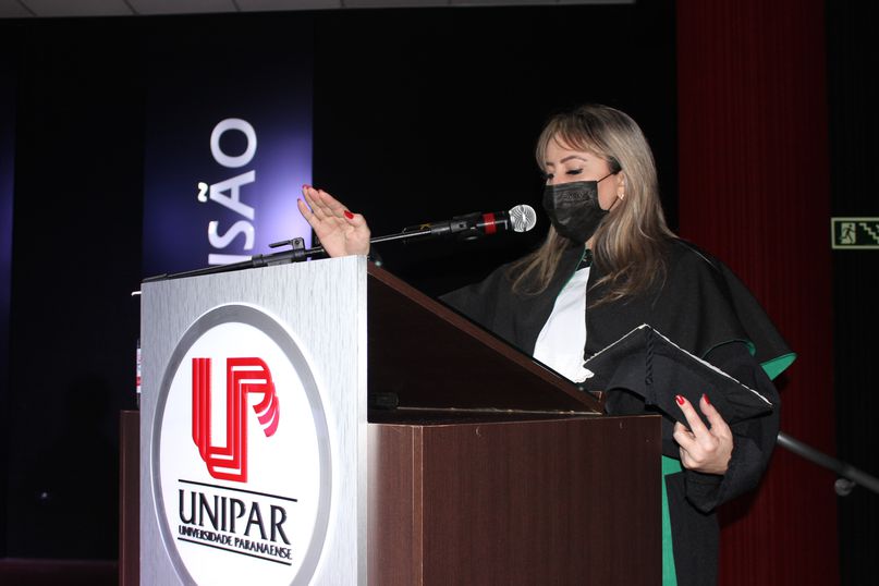 Da tribuna, conduziram os juramentos as formandas Letícia Pilarski e Aline da Silva. Como é de costume em todas as cerimônias de colação de grau da Unipar, os alunos que mais se destacaram nos anos cursados foram lareados. Do curso de Estética e Cosmética recebeu o certificado de honra ao mérito a bacharela Viviane Nishida, e de Biomedicina Aline da Silva. Honraria foi entregue pelos respectivos coordenadores, Luana Tedesco e Raphael Sahd.
