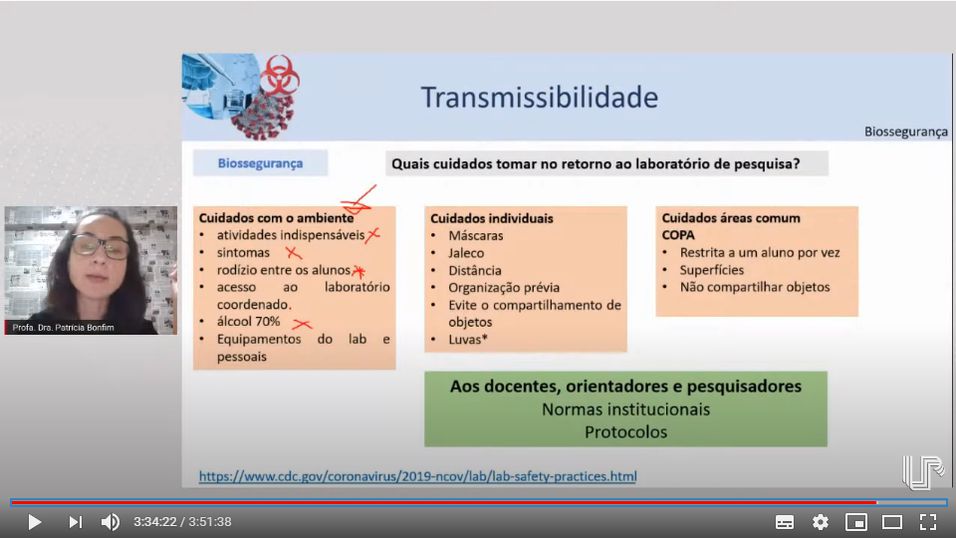 Também alertou sobre medidas de prevenção a serem realizadas nos laboratórios de pesquisa para evitar a transmissão, incluindo os cuidados relacionados ao ambiente e também os cuidados individuais como o uso dos EPI (equipamentos de proteção individual).