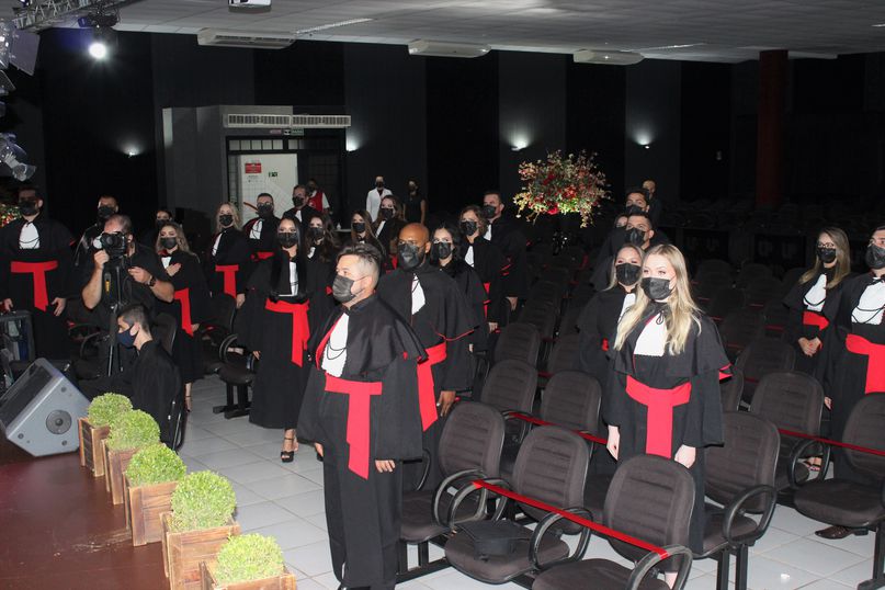 Com presença on-line, os professores foram homenageados: Eduardo Lazarin, nome de turma, Ademir da Veiga, patrono, e Juliane Bublitz, paraninfa. Da tribuna foi proferido o juramento do bacharel em Direito, pela formanda Dayane Martins.