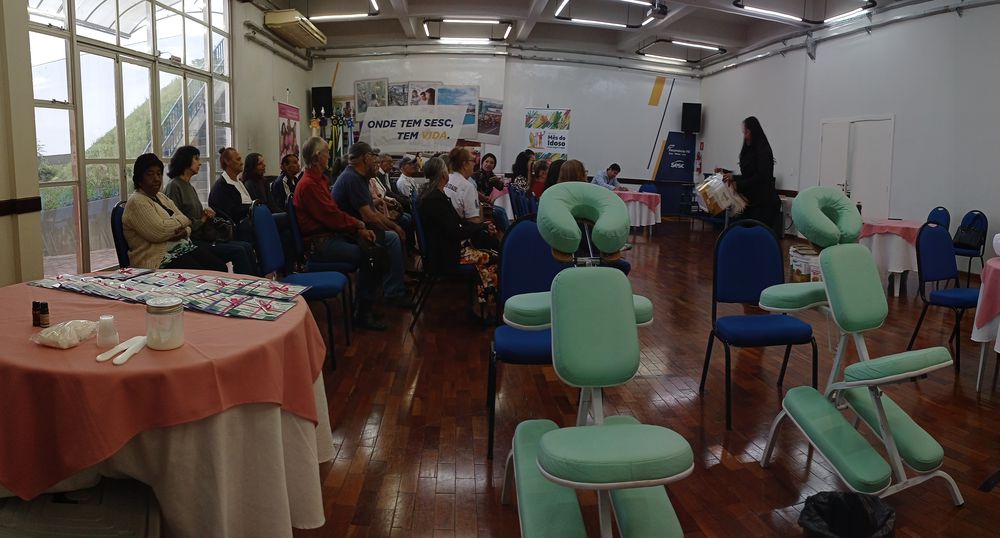 Na semana do idoso, a Fecomércio, promovida pelo Sesc, também contou com a presença dos acadêmicos (1º e 3º anos), que realizaram massagem na cadeira quick e cuidados para a pele da face. Outros 30 idosos receberam os cuidados.