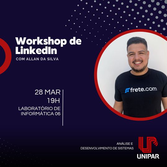 No dia 28 de março, o curso de Análise e Desenvolvimento de Sistemas da Universidade Paranaense – Unipar/Cianorte promoveu um workshop de Linkedin para os calouros, os acadêmicos do 1º período. O curso foi ministrado pelo Tecnólogo em Sistemas, Allan da Silva, ele que faz parte do DevParaná, cuja proposta é dar oportunidade para os desenvolvedores paranaenses começarem a compartilhar conhecimentos.