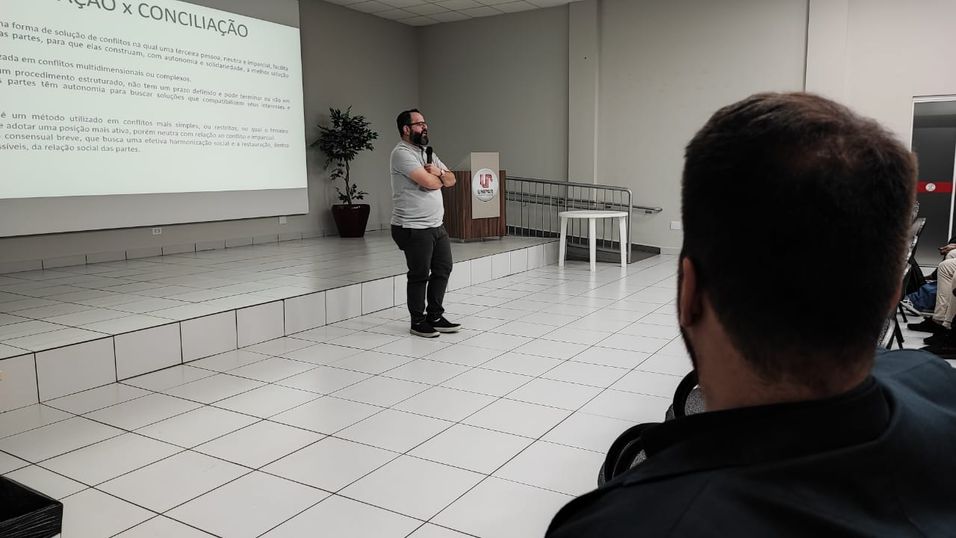 No último dia 23, acadêmicos do 3º, 4º e 5º ano do curso de Direito da Universidade Paranaense - Unipar, Unidade de Cianorte, participaram de uma atividade prática sobre as audiências de conciliação e mediação com o coordenador titular do Centro de Solução de Conflitos (CEJUSC), Douglas de Oliveira Zaghini, que é técnico judiciário do Tribunal de Justiça do Paraná.