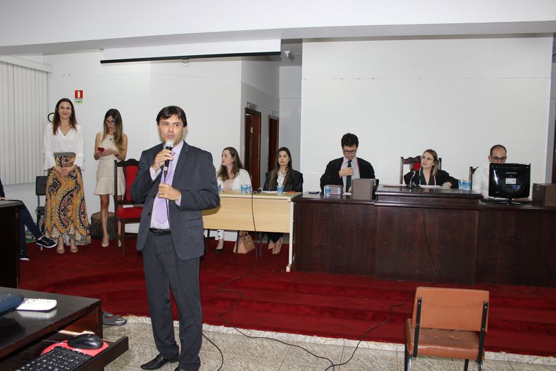 O Júri Simulado foi realizado no Tribunal do Júri da Universidade. Foi instalada a sessão em que o Ministério Público move contra o réu - denunciado matou a companheira por asfixia mecânica, pois ela queria se separar do denunciado.