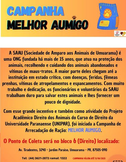 Nesta terça-feira (13), o curso de Direito da Universidade Paranaense – Unipar entregou à Sociedade de Amparo aos Animais de Umuarama (SAAU), 5.150 quilos de ração para cães e gatos, por meio da campanha ‘Melhor Aumigo’, promovida pelos acadêmicos do 3º período.