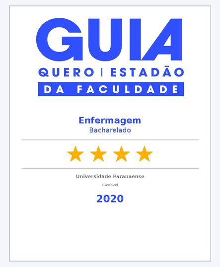 O Guia elenca profissões e as melhores universidades brasileiras, avaliando projeto pedagógico, corpo docente e infraestrutura. E sim, o curso de Enfermagem de Cascavel está entre os melhores do país e da região oeste do Paraná, assim como a Universidade Paranaense, que é 5 estrelas na avaliação do Ministério da Educação, conceito máximo.