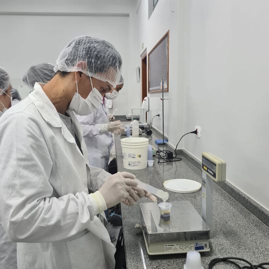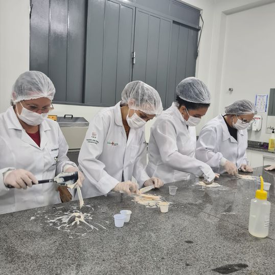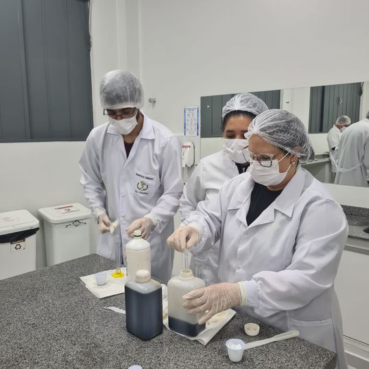 Os alunos também participaram de uma aula prática de manipulação de cosméticos, ministrada pela professora Milena Lorencete, no laboratório de Farmacologia.