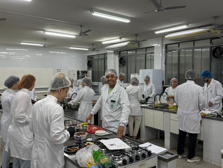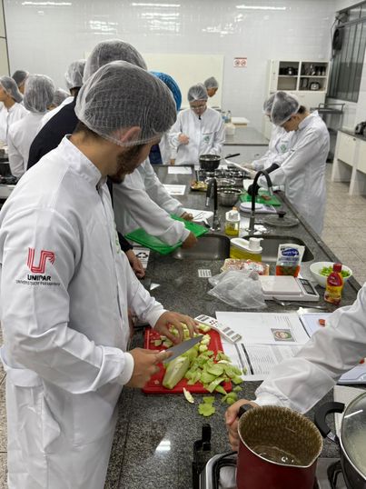 O curso de Nutrição da Universidade Paranaense (Unipar), campus Sede em Umuarama, realizou na última terça (11), a aula “Comfort Food e Gastronomia Hospitalar em Pediatria”, direcionada aos acadêmicos do 5º e 6º períodos, que acompanharam demonstrações práticas, experimentaram preparações e esclareceram dúvidas com os profissionais responsáveis. A atividade integrou a disciplina de Nutrição Hospitalar, ministrada pela professora Franciele Stefanoni Cia, e contou com a participação do nutricionista Renato Castro, convidado para conduzir a oficina.