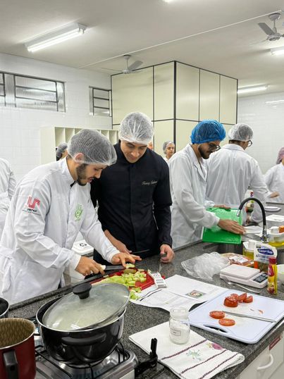 Com experiência na área de alimentação hospitalar, Renato Castro apresentou fundamentos técnicos relacionados ao cuidado nutricional de crianças hospitalizadas, destacando ajustes sensoriais, estratégias de acolhimento e adequações necessárias para diferentes condições clínicas. A prática ocorreu no Laboratório de Técnica Dietética da Unipar, onde foram demonstradas técnicas culinárias adaptadas ao contexto pediátrico.