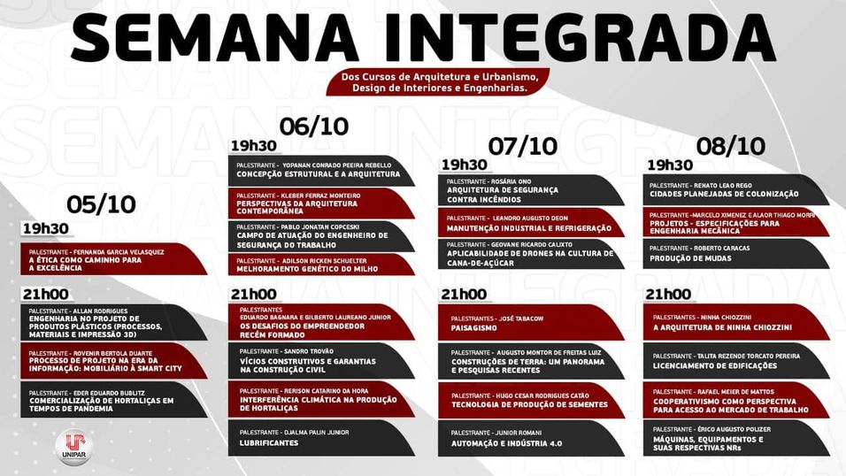De 05 a 08 de outubro, a Universidade Paranaense – Unipar promove a Semana Integrada 2021, dos cursos de Arquitetura e Urbanismo, Design de interiores e Engenharias (presenciais e semipresenciais), de todas as Unidades Universitárias.