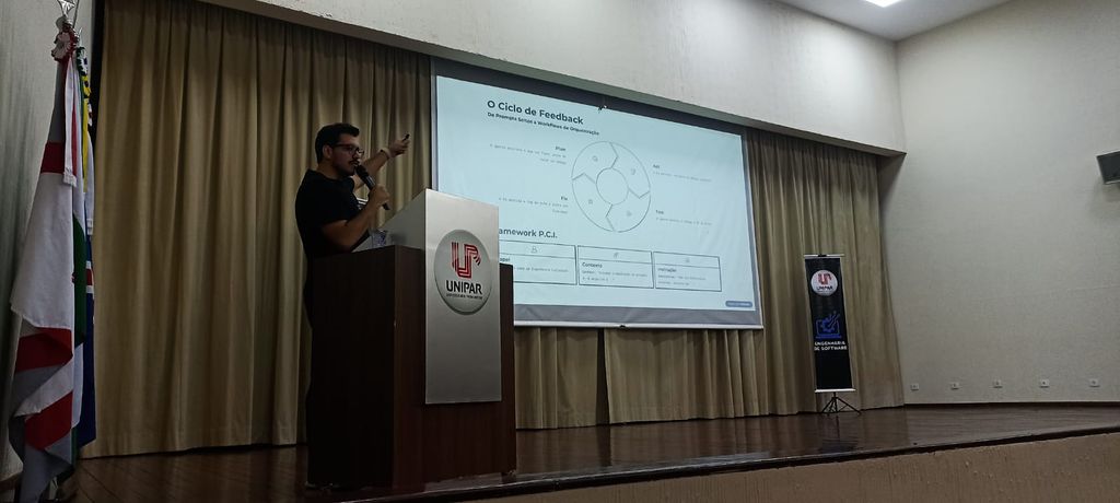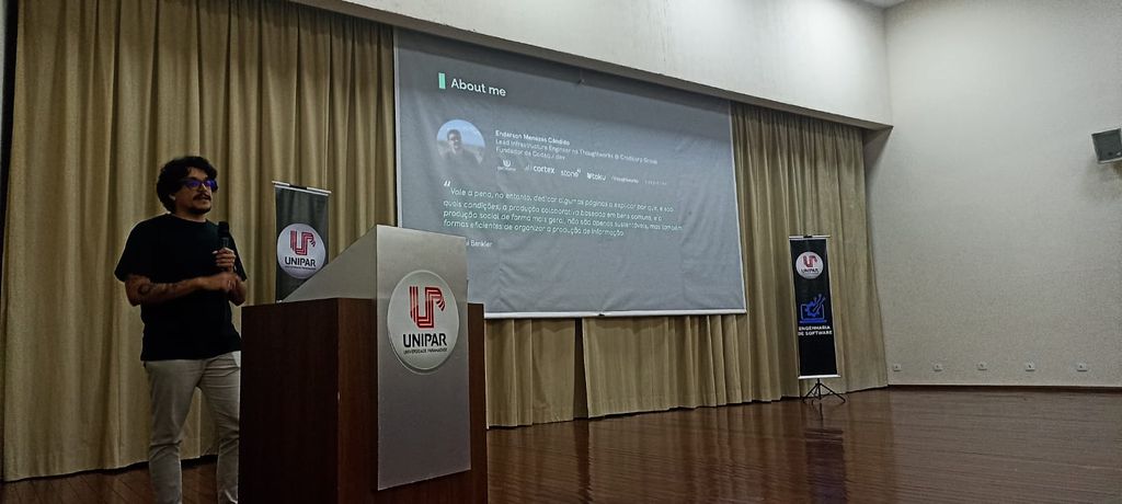 A primeira palestra da noite foi com o Desenvolvedor Full-Stack da empresa de Cianorte Log Sistemas Tiago Emanuel Baptista Pancotte, com o tema Vibe Coding & Agentic Workflows: O novo Stack do desenvolvimento. Já Enderson Menezes, Lead Infra, apresentou a palestra “GitHub e o Universo Open Source das Comunidades”, enfatizando a importância da colaboração em projetos de código aberto e o impacto dessas iniciativas na inovação tecnológica.