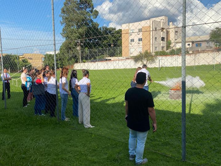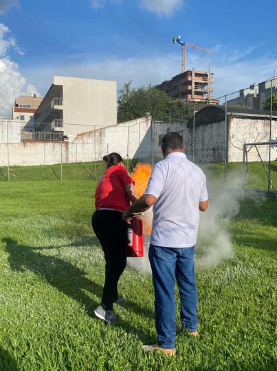 Em outra oportunidade, falou-se sobre manuseio de extintores e uso de mangueira para apagar incêndios na edificação, mas, principalmente, compreender o plano de evacuação do prédio.