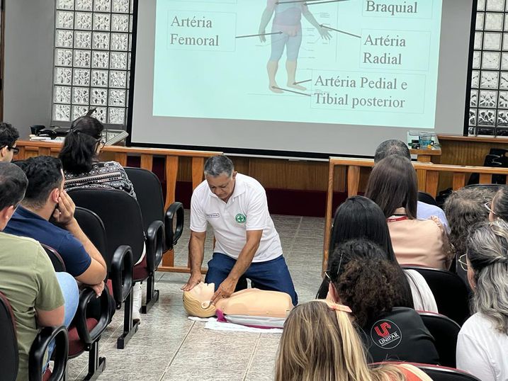 Os conteúdos englobaram protocolos de primeiros socorros, evidenciando sobre pressão arterial, quadro convulsivo, crise hipotensiva, desobstrução de vias áreas em adultos e utilização do DEA (Desfibrilador Externo Automático).