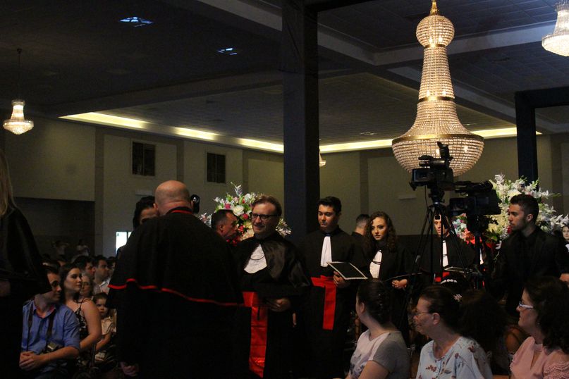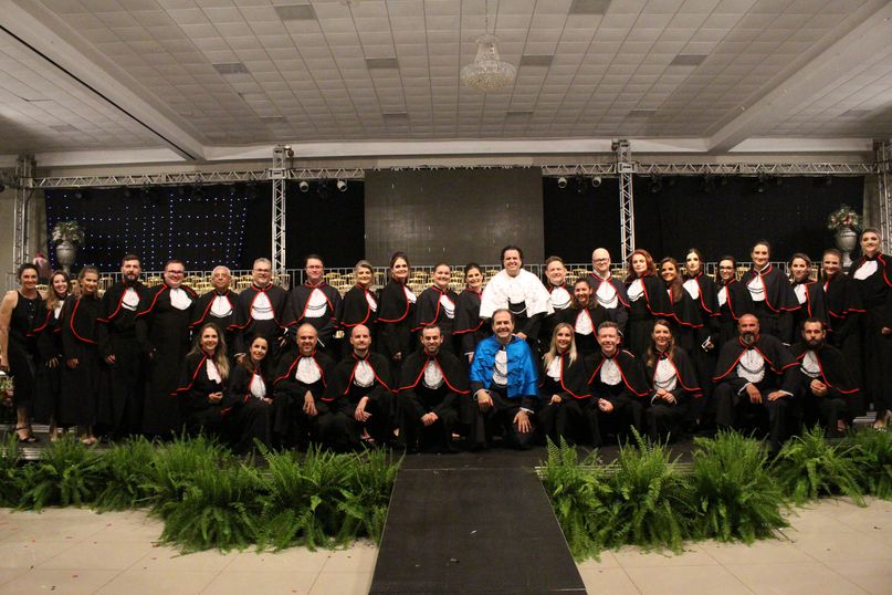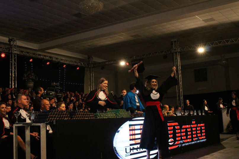 Juramentista – Eleitos pelos colegas, Jeandra Soares fez o juramento do bacharel em Ciências Biológicas; Jivago Bulsing Schott, do bacharel em Direito; Fernanda Cadoná, do bacharel em Educação Física; Maxiel Rodrigues Da Silva, da licenciatura em Educação Física; Julio Cesar Hartmann, do bacharel em Engenharia Civil; Alane Cristine Sestunpf Abati, do tecnólogo em Estética e Cosmética; Beatriz Oliveira De Sousa, do bacharel em Odontologia; Eduardo Jose Canzi, do bacharel em Administração; Vinicius Eduardo Megiolaro, do bacharel em Arquitetura e Urbanismo; Samara Nonato Fontana, do bacharel em Ciências Contábeis; Marieli Ribeiro, do bacharel em Enfermagem; Bianca Caroline Pansera, do bacharel em Farmácia; Gabriel Klump Da Silva, do bacharel em História; Jaqueline Lemes De Souza, do bacharel em Nutrição; Jeferson Patrick Kamanski, do bacharel em Sistemas da Informação.