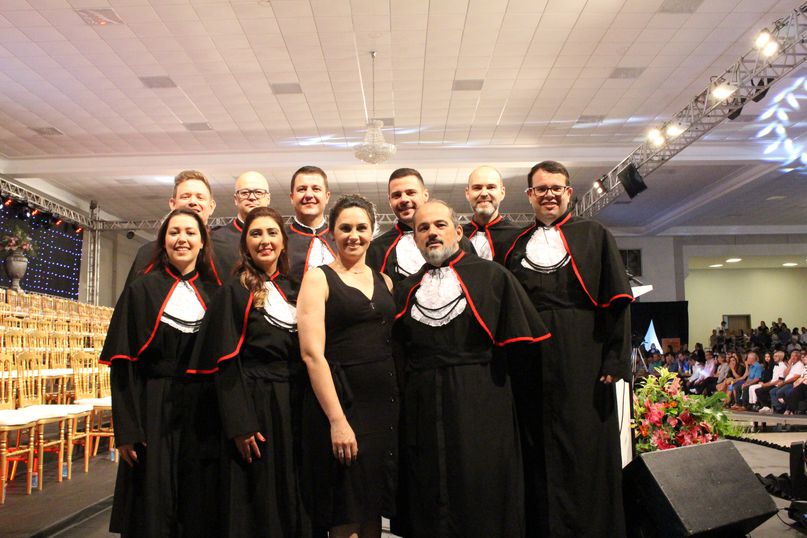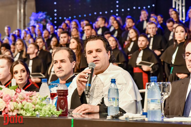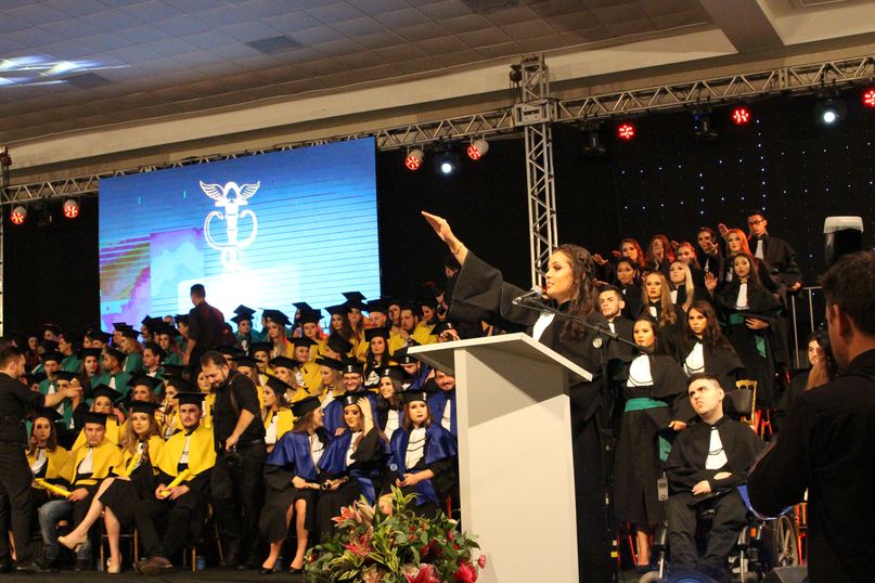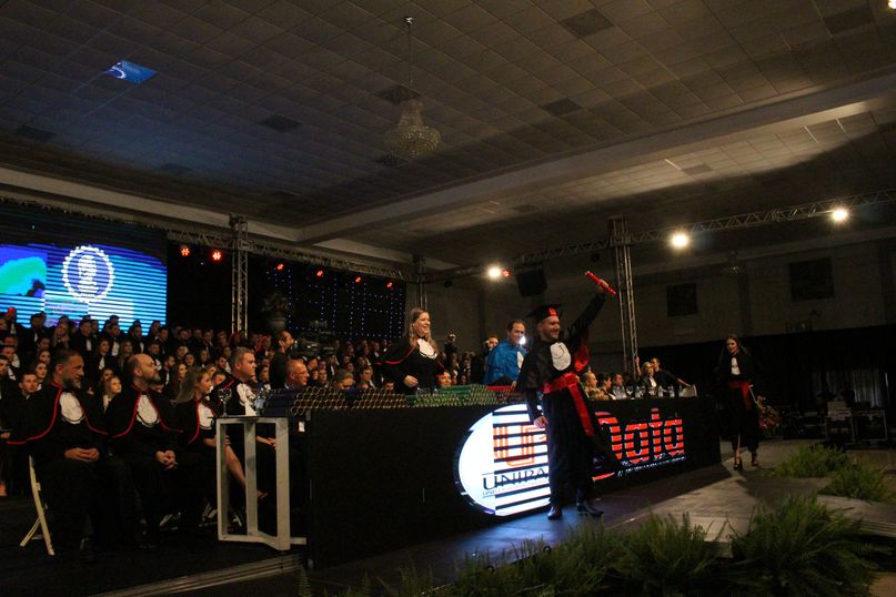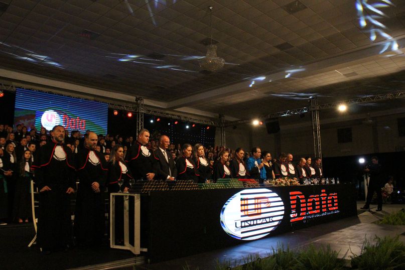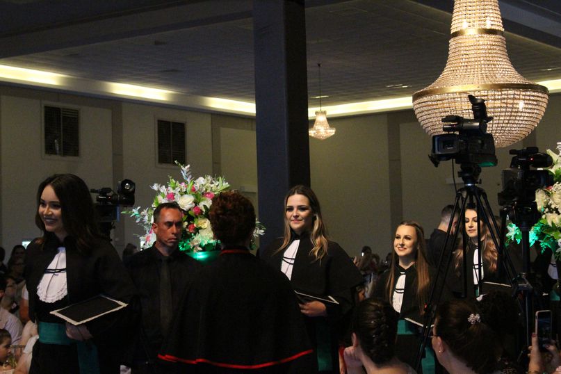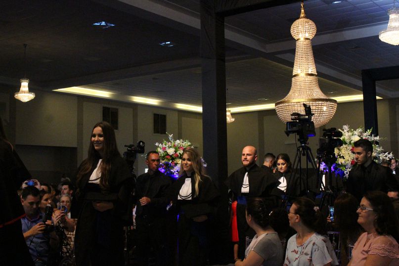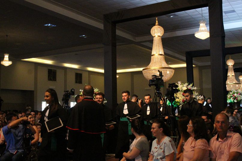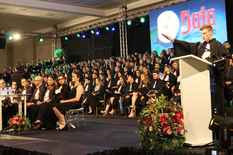 Juramentista – Eleitos pelos colegas, Jeandra Soares fez o juramento do bacharel em Ciências Biológicas; Jivago Bulsing Schott, do bacharel em Direito; Fernanda Cadoná, do bacharel em Educação Física; Maxiel Rodrigues Da Silva, da licenciatura em Educação Física; Julio Cesar Hartmann, do bacharel em Engenharia Civil; Alane Cristine Sestunpf Abati, do tecnólogo em Estética e Cosmética; Beatriz Oliveira De Sousa, do bacharel em Odontologia; Eduardo Jose Canzi, do bacharel em Administração; Vinicius Eduardo Megiolaro, do bacharel em Arquitetura e Urbanismo; Samara Nonato Fontana, do bacharel em Ciências Contábeis; Marieli Ribeiro, do bacharel em Enfermagem; Bianca Caroline Pansera, do bacharel em Farmácia; Gabriel Klump Da Silva, do bacharel em História; Jaqueline Lemes De Souza, do bacharel em Nutrição; Jeferson Patrick Kamanski, do bacharel em Sistemas da Informação.