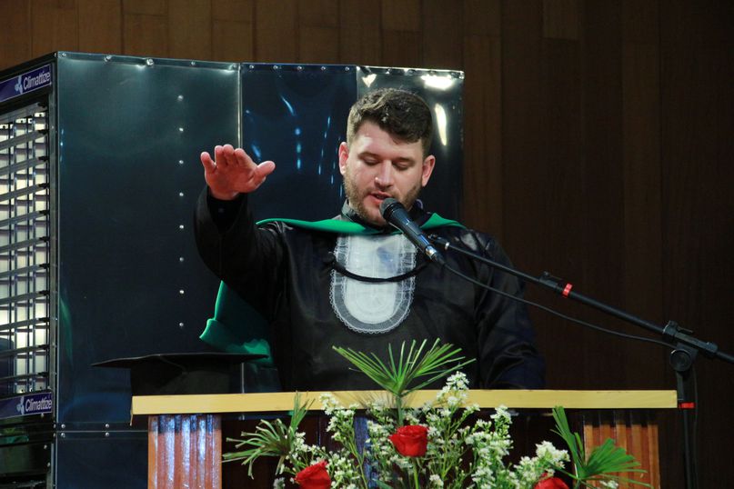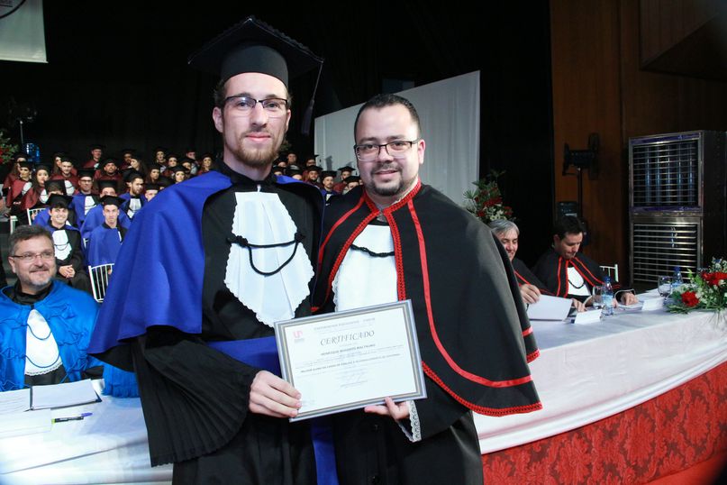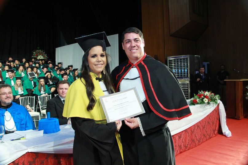 Juramentista – Eleitos pelos colegas, Patricia dos Reis da Silva fez o juramento do bacharel em Educação Física (bacharelado); Andressa Negrini de Miranda fez o juramento em Educação Física (licenciatura); Jaine Maikiely da Silva fez o juramento do bacharel em Farmácia; Alan Gross Hemsing fez o juramento do bacharel em Fisioterapia; Henrique Augusto Maltauro fez o juramento do bacharel em Análise e Desenvolvimento de Sistemas; Junior Soares dos Santos fez o juramento do bacharel em Direito; Julia Thais Volkweis fez o juramento do bacharel em Ciências Contábeis; Ana Caroline Schreiner fez o juramento do bacharel em Arquitetura e Urbanismo; Sergio Henrique de Oliveira Niehues fez o juramento do bacharel em Engenharia Civil; Patricia Leseux fez o juramento do bacharel em Estética e Cosmética.
