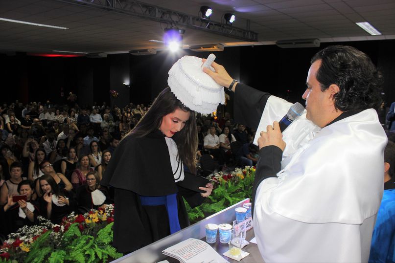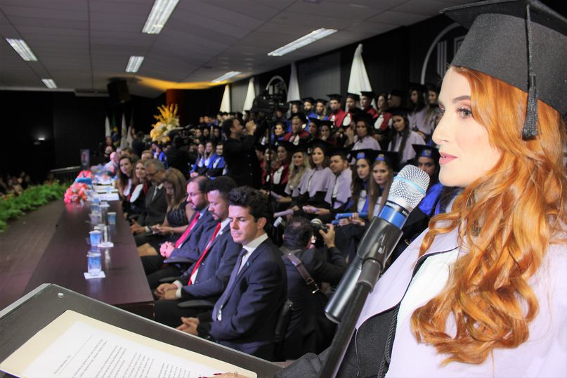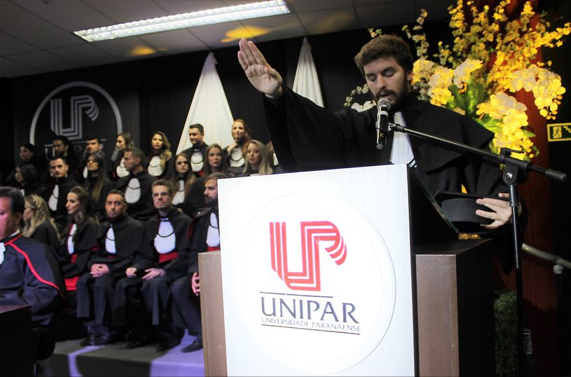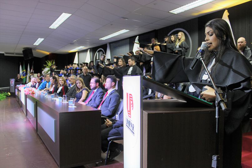 Os formandos proferiram o juramento profissional. Da tribuna, a acadêmica Bruna Iurczoki proferiu o juramento do tecnólogo em Estética e Cosmética, Karen Brustolin, do psicólogo, Bruna Pasqualotto, do bacharel em Engenharia Civil, Thais de Lima, do bacharel em Sistemas de Informação, Thalitta Vicente, do bacharel em Arquitetura e Urbanismo, Emily Molon, do bacharel em Ciências Contábeis, Cláudia Salvador, do tecnólogo em Design de Moda, Matheus Baroni, do professor, Amauri Folmann Junior, do bacharel em Administração, Eduardo Taguti, do bacharel em Direito, Lorraine dos Reis, do bacharel em Biomedicina, e Cinthia Berft, do bacharel em Odontologia.