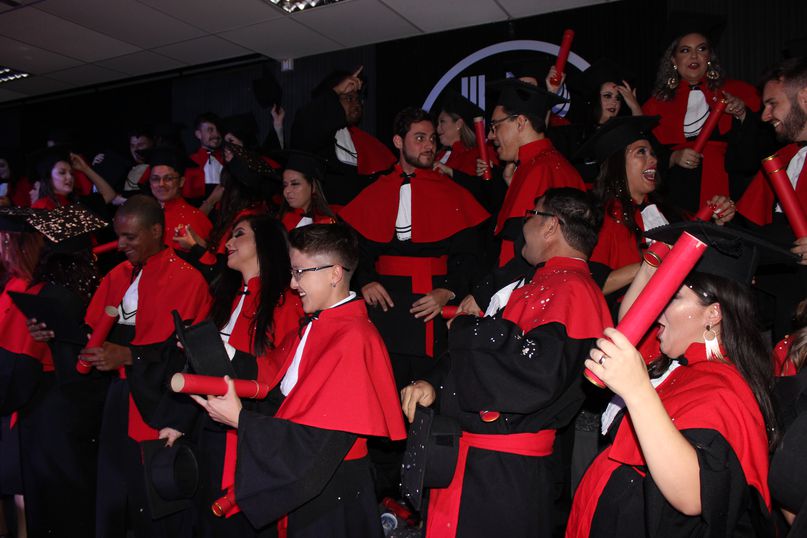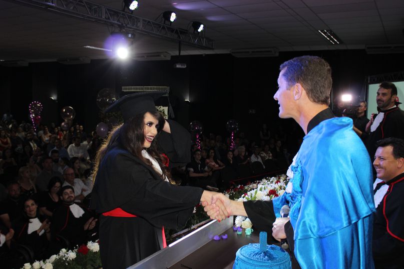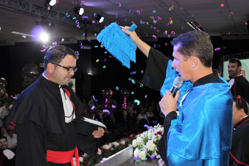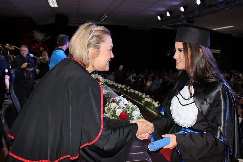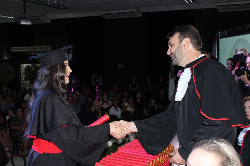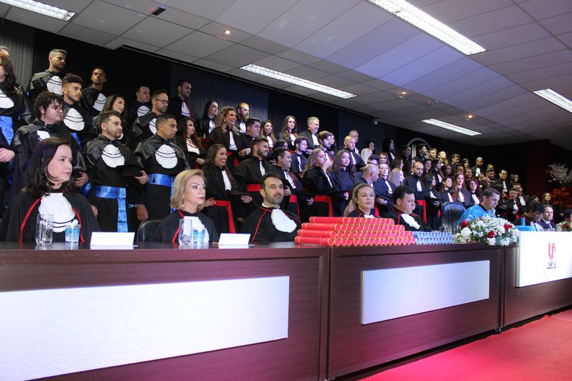 Outro momento de entusiasmo foi o juramento profissional. Da tribuna, Jhennifer Ruthes proferiu o juramento do bacharel em Administração, e Letícia Gomes fez o juramento do bacharel em Direito. Com palavras de gratidão, o bacharel Marcelo Truffa foi o orador das turmas.
