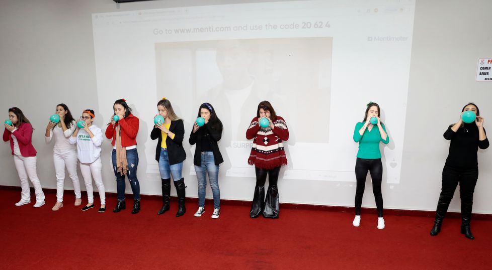 Os alunos foram divididos em nove equipes, cada uma identificada por uma cor, que tiveram que responder sobre temais atuais e de conhecimentos gerais e específicos e participar de provas surpresas lúdicas, em forma de gincana.