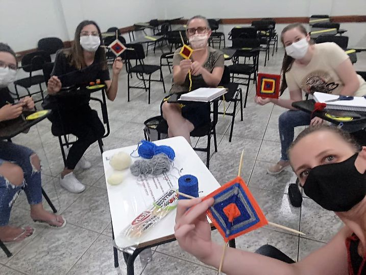 A proposta foi aprender a produzir mandalas. Como matéria-prima utilizaram materiais de fácil acesso e baixo custo, como espetinhos de churrasco e restos de lã.