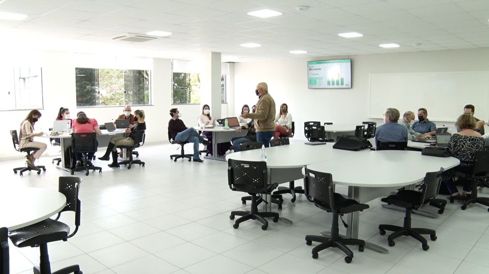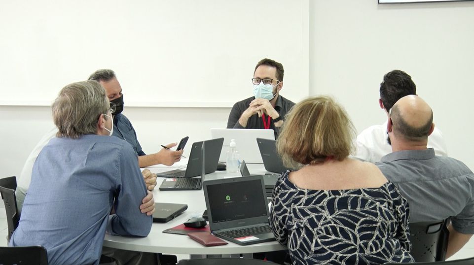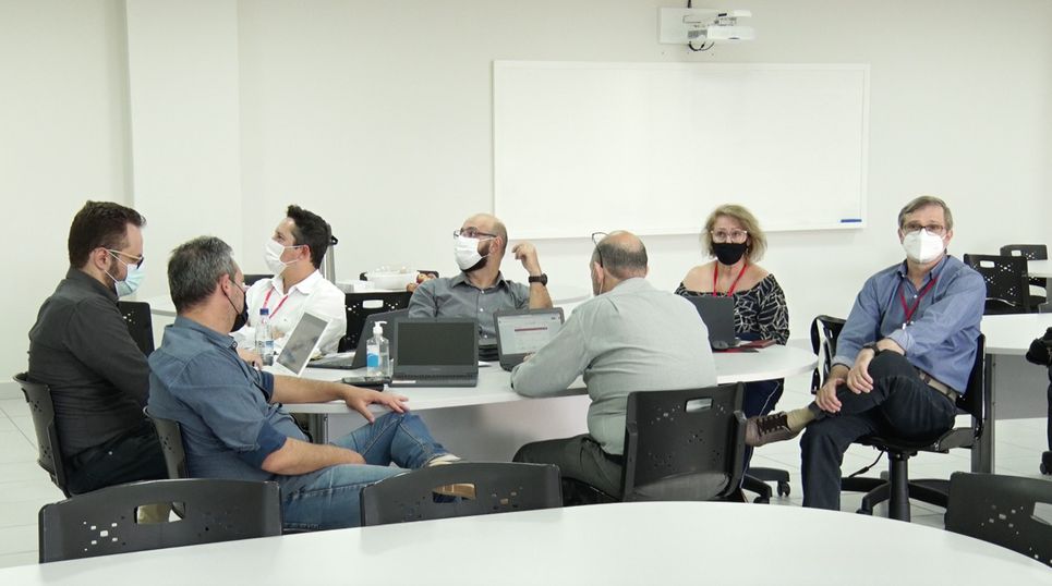 À frente, ministrando o conteúdo aos professores da Unipar, o Dr. Olavo Franco Ferreira Filho, que atualmente é professor titular do departamento de Clínica Médica da Universidade Estadual de Londrina (UEL). O médico tem experiência na área de Pneumologia, Epidemiologia e Educação Médica, com ênfase em metodologias ativas e nos processos de avaliação, em especial na elaboração de itens e na análise de teste de progresso.