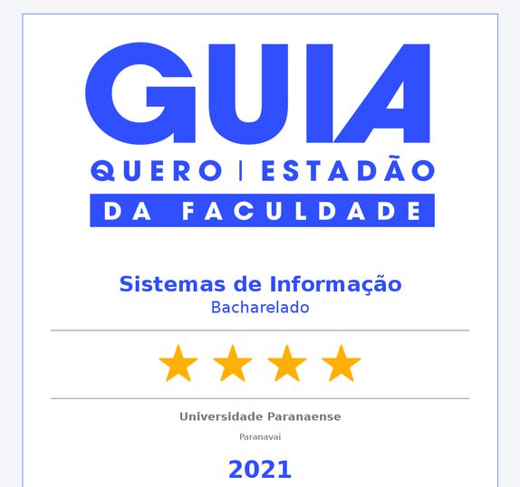 A Universidade Paranaense – Unipar/Paranavaí comemora a conquista do selo 4 estrelas para o curso de Sistemas de Informação. A avaliação foi feita pelo Guia da Faculdade, do jornal Estadão. Para isso, o Guia utiliza uma metodologia conhecida como ‘avaliação por pares’, que analisa a qualidade de quase 16 mil cursos superiores em todo o Brasil.