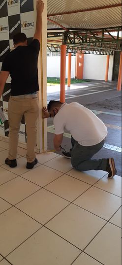 O estudante Fabrício Sales, estagiário do EMEC, foi até o colégio para executar a tarefa, com orientação do engenheiro civil João Rigobello, responsável técnico do escritório.