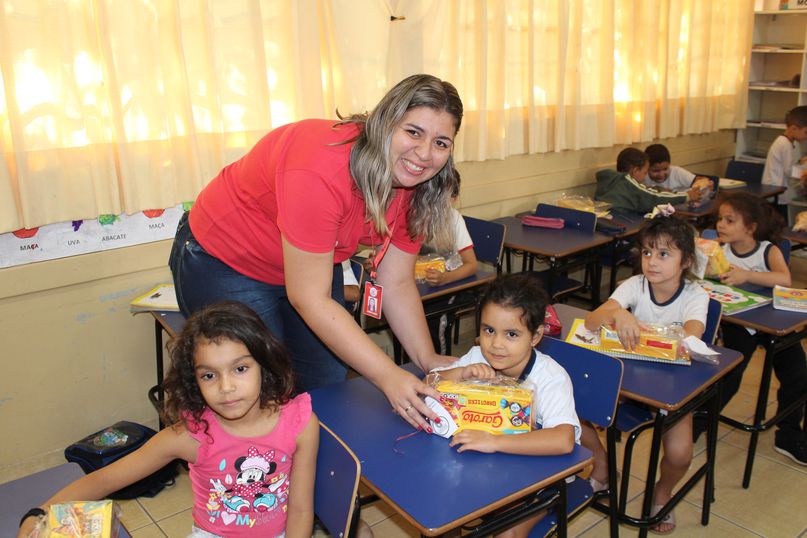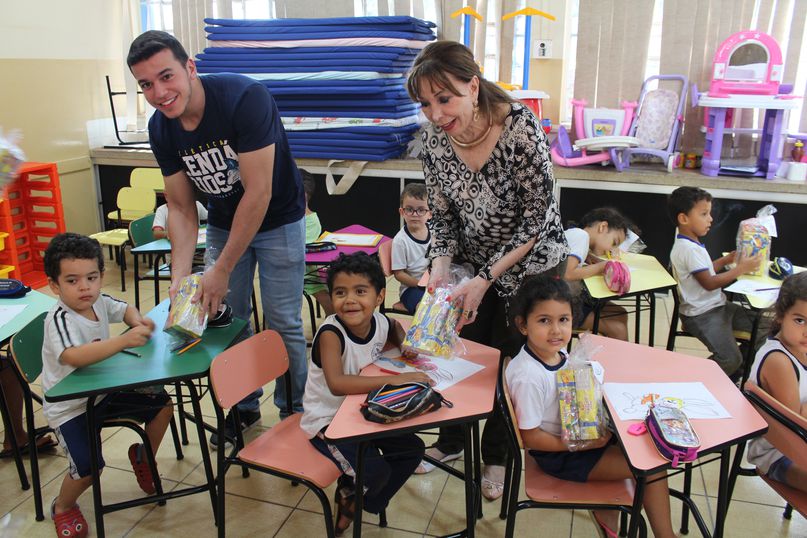 Ela, a diretora e Ruiz fizeram questão de participar da distribuição dos doces, na escola.