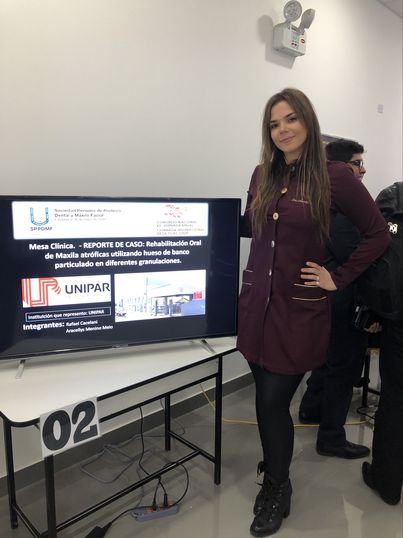 Desbancando outros grandes trabalhos da América Latina, a excelente qualidade da pesquisa, que tem como título ‘Reabilitação oral de maxila atrófica utilizando osso de banco particulado em diferentes granulações’, rendeu à aluna da Unipar uma bolsa de estudos na Universidade Cayetano Heredia, do Peru. O grande feito foi comemorado também pelos seus orientadores, os professores Janes Francio Pissaia, Rodrigo Scaratti e Rafael Cacelani, que foi um dos convidados para ministrar conferência no evento internacional promovido pela Sociedade Peruana de Prótese Dental e Maxilo Facial.