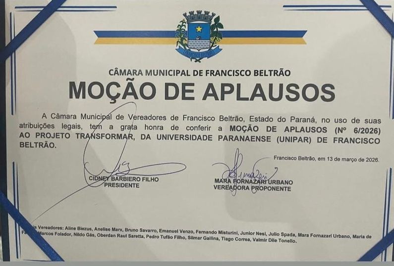 O Projeto Transformar, desenvolvido pelo curso de Direito da Universidade Paranaense (Unipar), campus de Francisco Beltrão, foi homenageado com uma Moção de Aplausos pela Câmara de Vereadores do município. A entrega ocorreu na sessão do dia 11 de março de 2026. A proposição foi feita pela vereadora Mara Fornazari Urbano e aprovada por unanimidade pelo plenário.