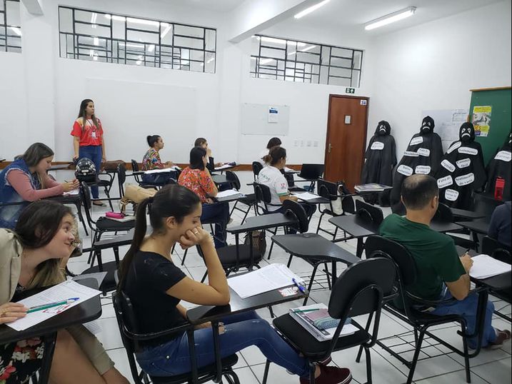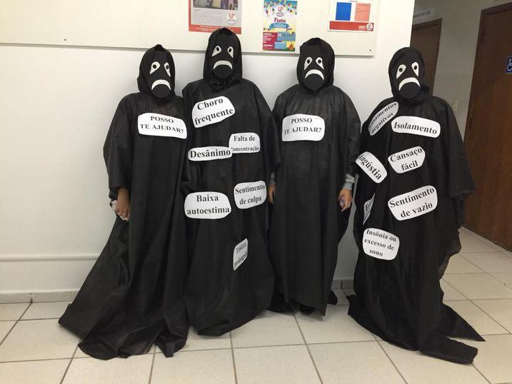 Acompanhados da responsável técnica do PAAE, Paloma Thainá dos Santos, os alunos passaram pelos corredores e salas vestidos de preto, cobertos da cabeça aos pés e com máscaras de olhares entristecidos. Nas roupas estavam expressões como: falta de interesse, baixa autoestima, falta de concentração, pensamentos negativos, tristeza prolongada e choro frequente.