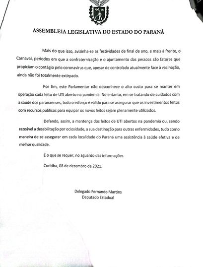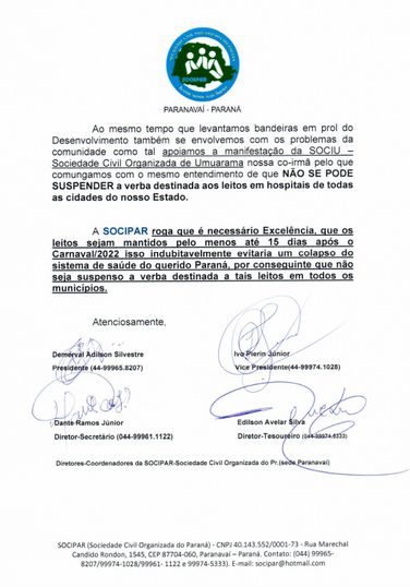 A Sociedade Civil Organizada do Paraná (SOCIPAR) apoia a iniciativa e, diante disso, protocolou na Secretária de Estado da Saúde do Paraná, o ofício para que a verba seja mantida até 15 dias após o Carnaval/2022. Segundo alegam, o pedido tem como objetivo evitar um colapso do sistema de saúde. “Estamos confiantes que seremos atendidos, pois a SOCIPAR acatou a nossa demanda e a requisição agora se tornou estadual”, explicou Bruno.