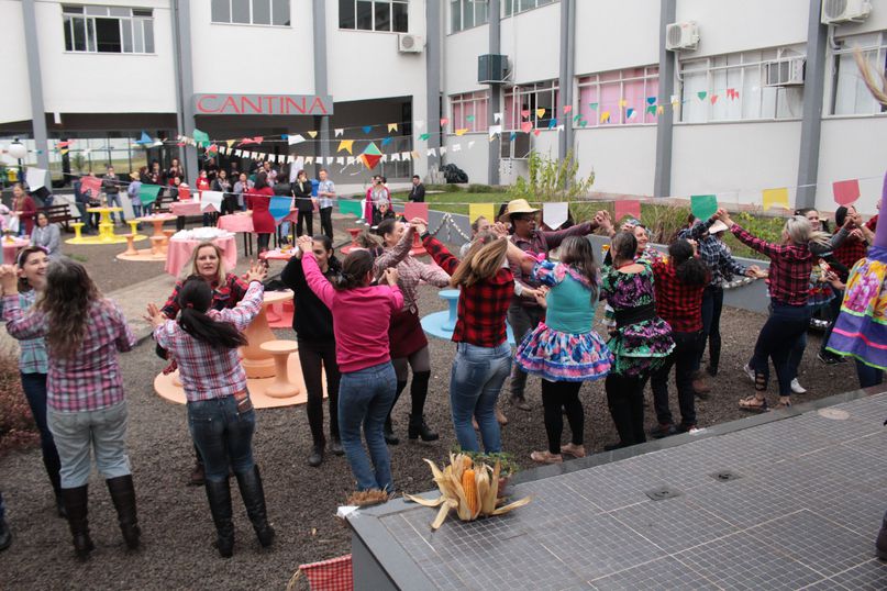 Os colaboradores foram desafiados a participar de uma dança de quadrilha improvisada. A professora Duda Schiavoni e acadêmicos do curso de Educação Física conduziram a atividade, que incluiu movimentos de ginástica laboral e passos de quadrilha, a fim de estimular a prática de exercícios físicos.