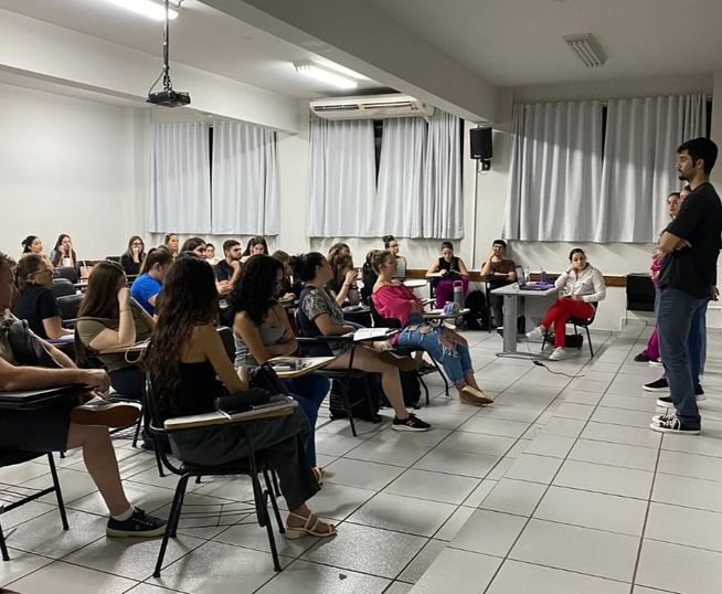 A equipe realizou mini palestras em sala de aula, com acadêmicos de diversos cursos. A atividade aconteceu em parceria com o CAPS II (Centro de Atenção Psicossocial), incluindo uma roda de conversa com pacientes e seus familiares. O foco foi refletir sobre os desafios do Transtorno Bipolar, a importância do diagnóstico, tratamento adequado e rede de apoio.