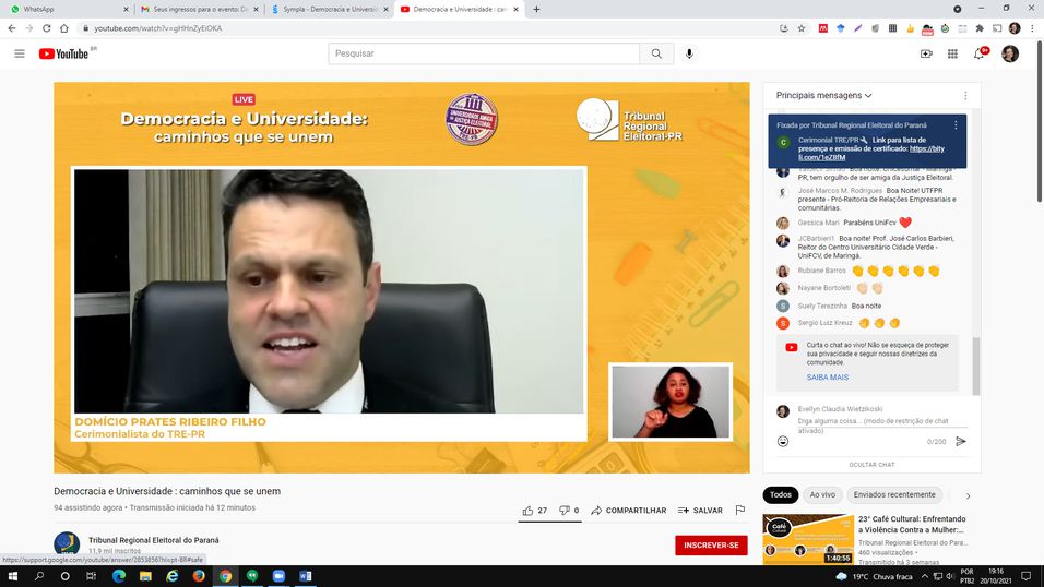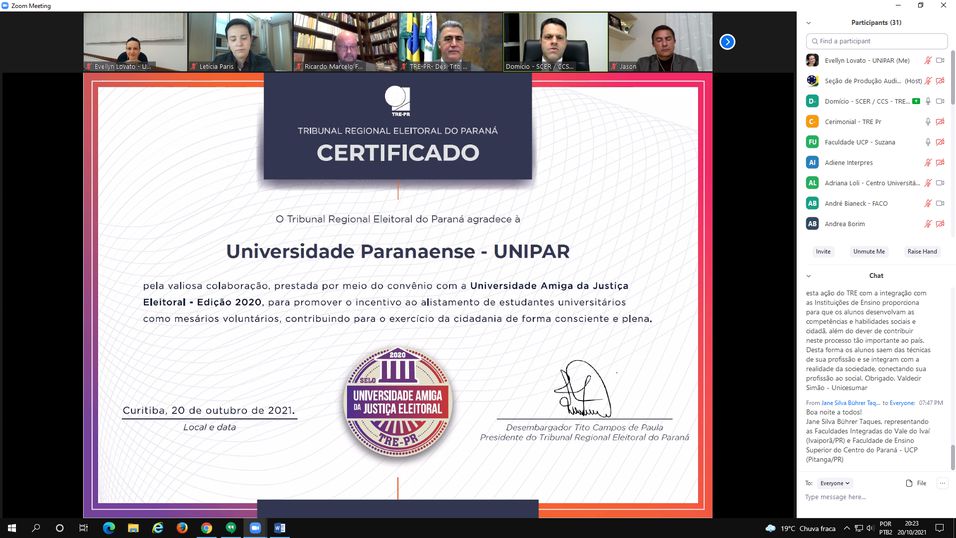 Nesta semana, em uma solenidade remota, a Universidade Paranaense – Unipar recebeu, por meio da Coordenadoria de Pesquisa e Extensão (Copex), o certificado de Universidade Amiga da Justiça Eleitoral. Na oportunidade, a coordenadora da Copex, professora Evellyn Claudia Wietizikoski Lovato representou a Reitoria da Unipar.