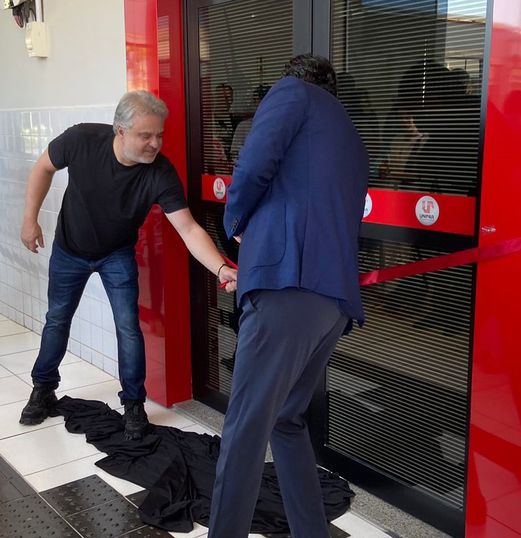 Emocionados, os filhos Dr. Carlos Eduardo Garcia (Reitor) e Dr. Cássio Eugênio Garcia (Diretor Executivo de Gestão de Assuntos Comunitários), descerraram a placa com o nome da mãe, abrindo oficialmente o espaço.