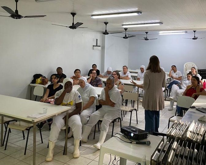 Nesta semana, a Universidade Paranaense – Unipar participou do projeto Saúde dos colaboradores da Cozinha Social, da prefeitura de Toledo. A psicóloga Jéssica Fernanda Lagni foi convidada para ministrar palestra à equipe sobre a relação do sujeito com a comida e sua função social e emocional.