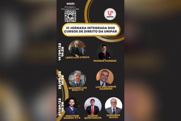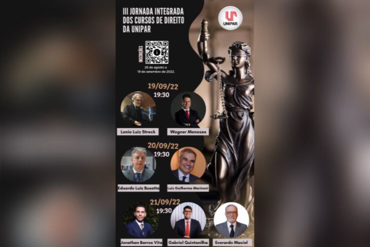 A Universidade Paranaense – Unipar já está com tudo organizado para a realização da III Jornada Integrada dos cursos de Direito. De 19 a 21 de setembro, sete profissionais de renome na área, ministram palestras com temas relevantes na atualidade e diversificados, aos participantes. Todos os momentos serão transmitidos pelo canal oficial da Unipar, no Youtube, a todos os professores e acadêmicos dos cursos de Direito da Unipar, em todas as suas unidades universitárias.