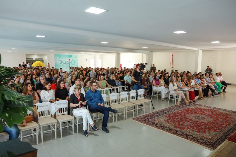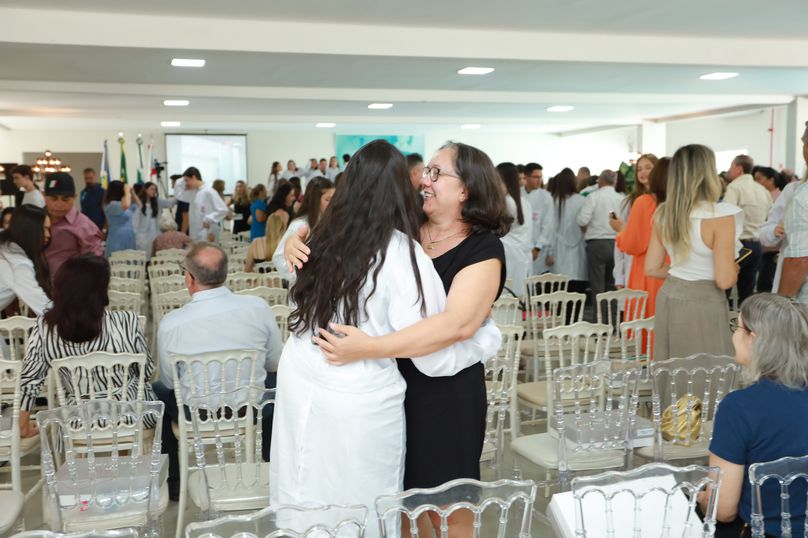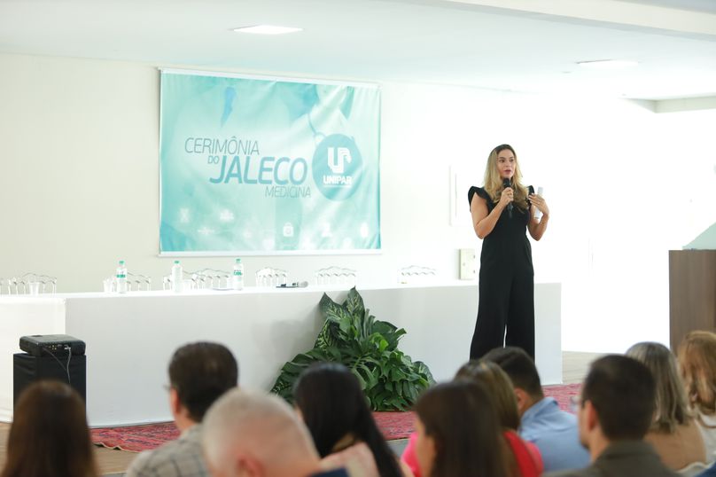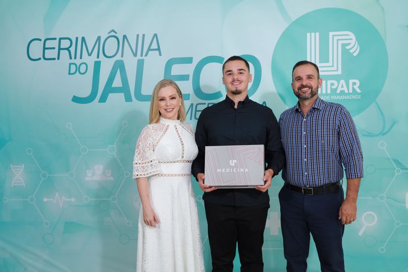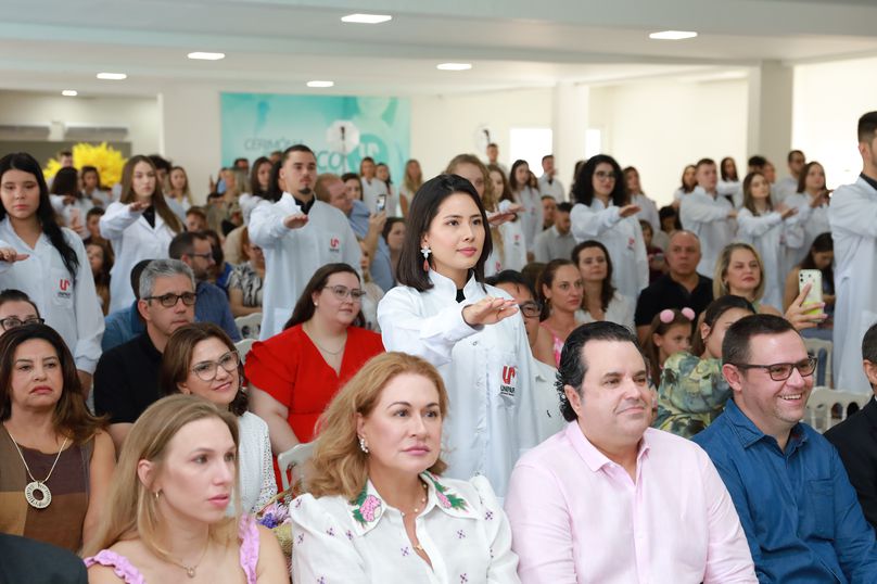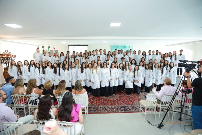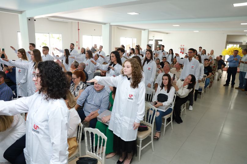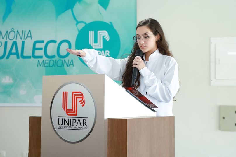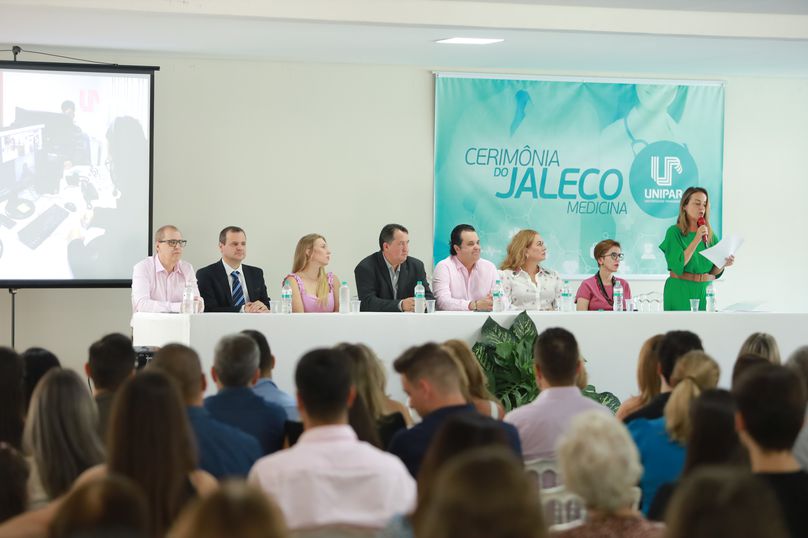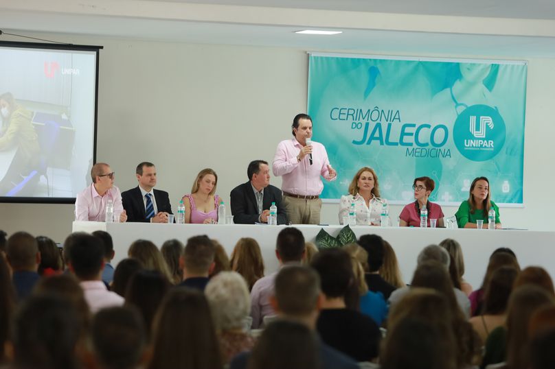 O momento marcou a entrega dos jalecos aos alunos que integram a sexta turma do curso de Medicina da Unipar, representando oficialmente o início de uma nova jornada, em que vestem pela primeira vez o jaleco branco, um dos símbolos da profissão médica.