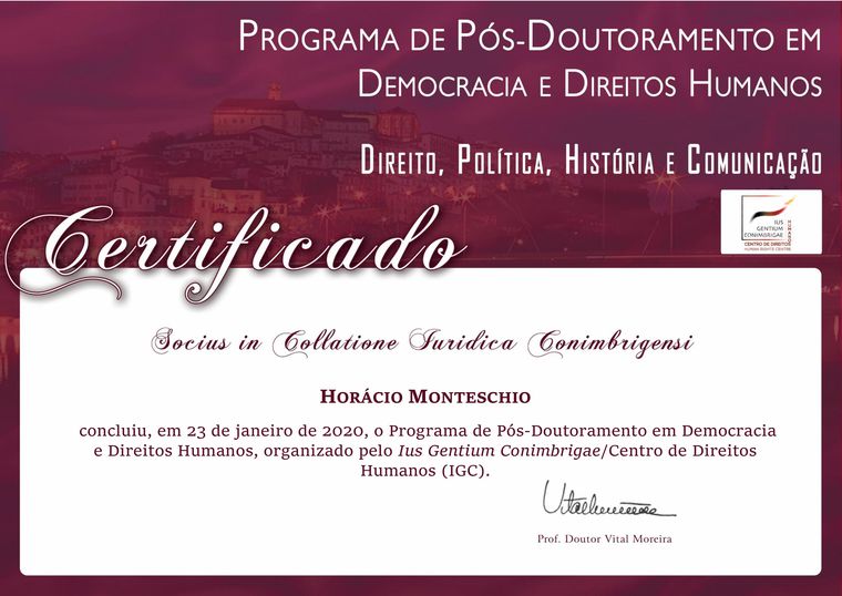 Com muita dedicação e paixão à pesquisa, o professor Horácio Monteschio da Universidade Paranaense - Unipar, Unidade de Guaíra, comemora conclusão de pós-doutoramento em Democracia e Direitos Humanos pelo IGC – Ius Gentium Conimbrigae (em português, Centro de Direito Humanos) da Faculdade de Direito da Universidade de Coimbra/Portugal.